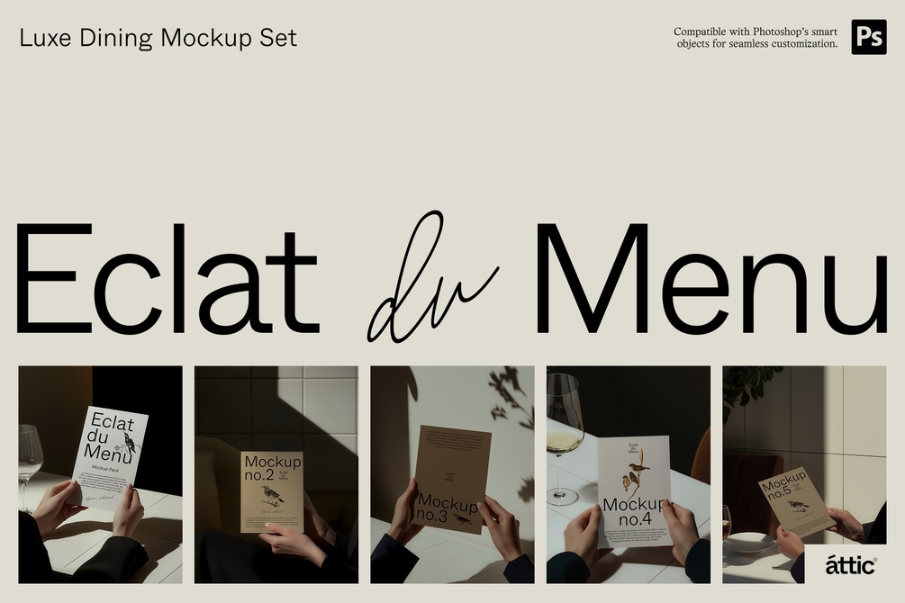 Éclat du Menu strikes a balance between simplicity and artistic flair, featuring menu mockups that highlight your designs without overwhelming them. Perfect for a seasonal refresh or a brand-new concept, each scene captures a refined, understated atmosphere.