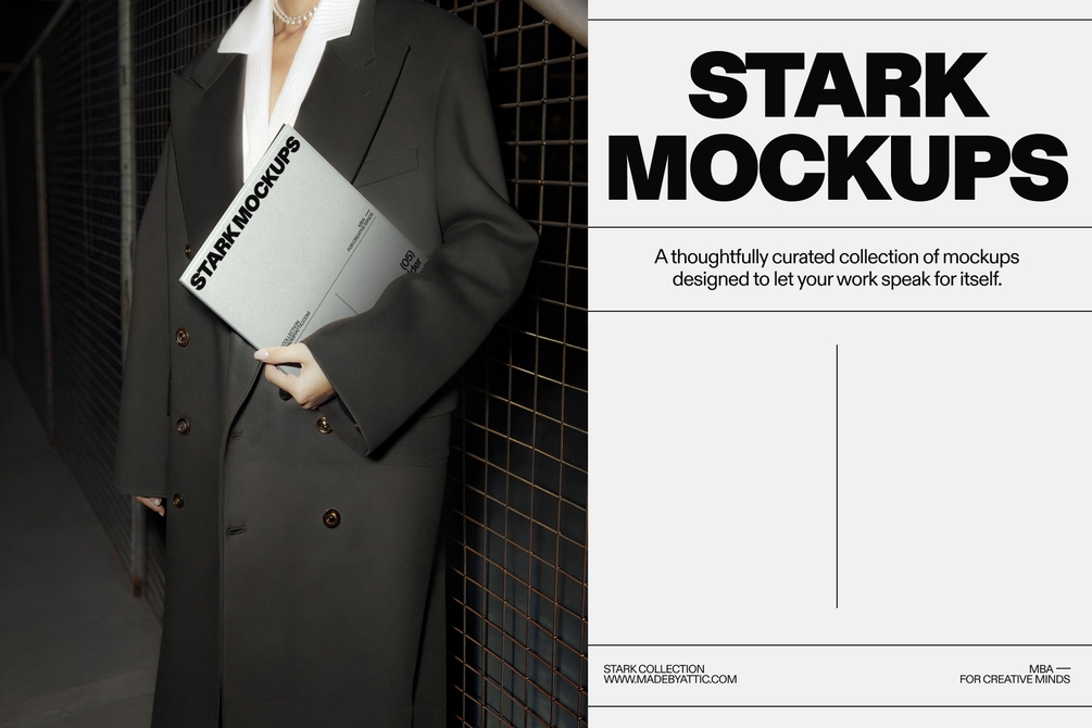Stark is a collection of mockups designed with simplicity and clarity in mind. Each mockup offers a clean, unadorned canvas that lets your designs take center stage, without unnecessary embellishments.