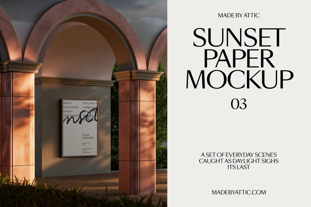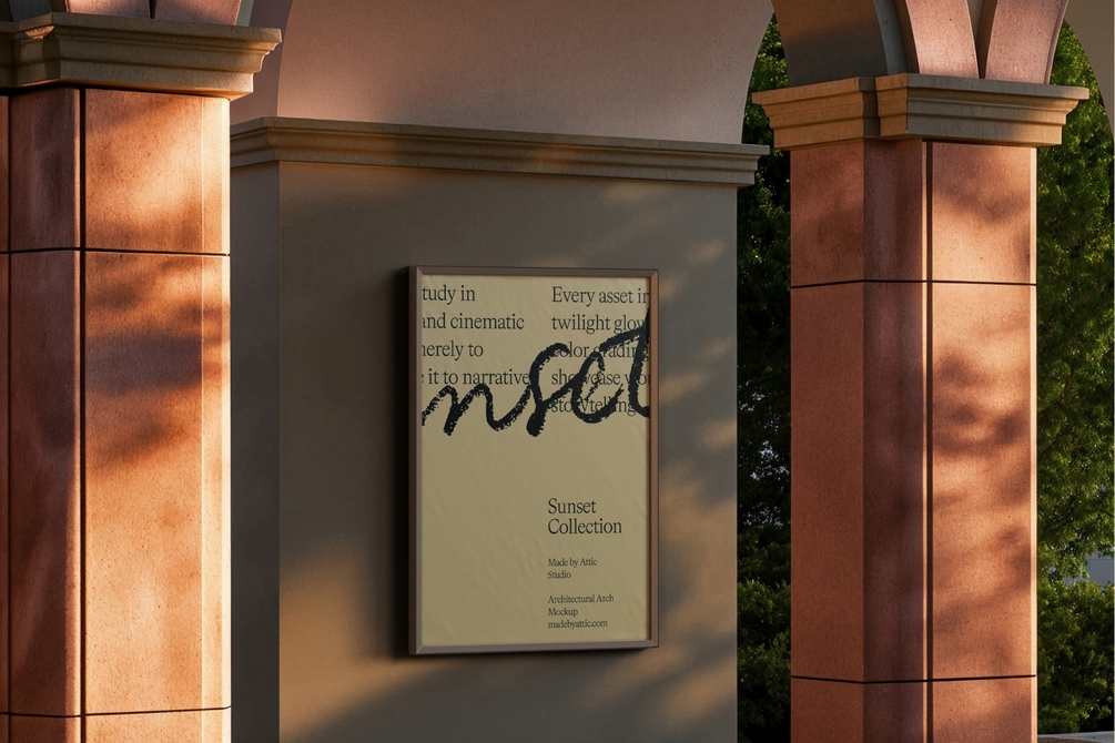 The Sunset 03 Mockup is a study in architectural calm. Framed by terracotta pink arches and set against a cool grey structural wall, this vertical poster mockup is bathed in complex, dappled leaf shadows. It perfectly captures the "Golden Hour" in a Mediterranean or cultural setting. This asset is essential for brands that need to whisper rather than shout—ideal for museum exhibitions, high-end fashion campaigns, or minimalist typography that requires a textured, organic stage.