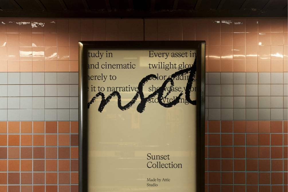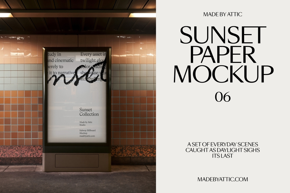 The Sunset 06 Mockup captures the cinematic atmosphere of underground infrastructure. Featuring a vertical illuminated billboard set against a retro tiled wall, this scene is defined by its overhead fluorescent reflections and deep, ambient shadows. It provides a powerful, high-contrast frame for campaign imagery, concert posters, or brutalist typography. Unlike clean studio billboards, this asset offers the "noise" and texture of the real world, grounding your design in a tangible urban environment.