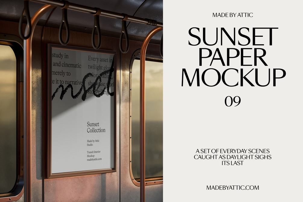 The Sunset 09 Mockup places your design in the quiet moments of urban travel. This high-fidelity train interior mockup features a framed poster inside a transit car, defined by warm metallic reflections. The copper handrails create a rich, industrial frame for your work.
