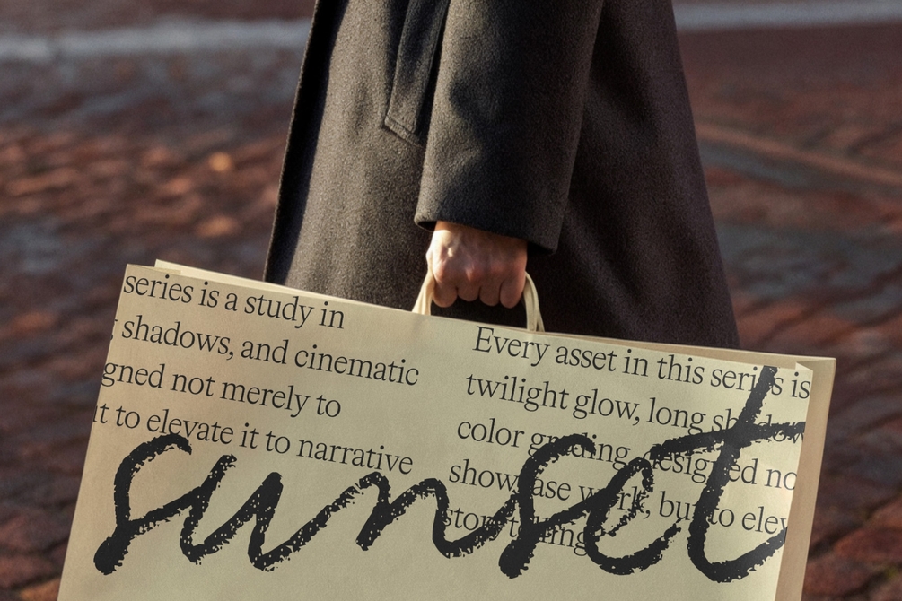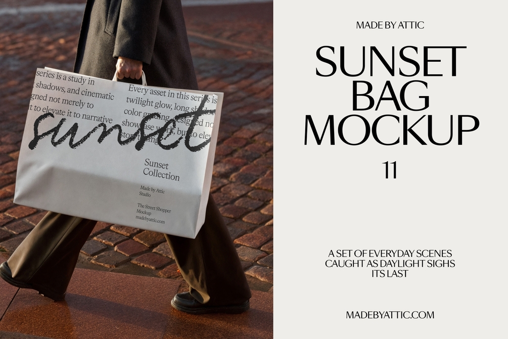 The Sunset 11 Mockup captures the movement of high-end consumer culture. Featuring a large paper shopping bag held by a model in motion, this scene is set against warm, urban cobblestones at golden hour. The wide-leg trousers and chunky boots give it a distinct "fashion week" street-style aesthetic. This asset is essential for boutique branding, e-commerce packaging reveals, or fashion labels that want to showcase their physical touchpoints in a realistic, dynamic environment.